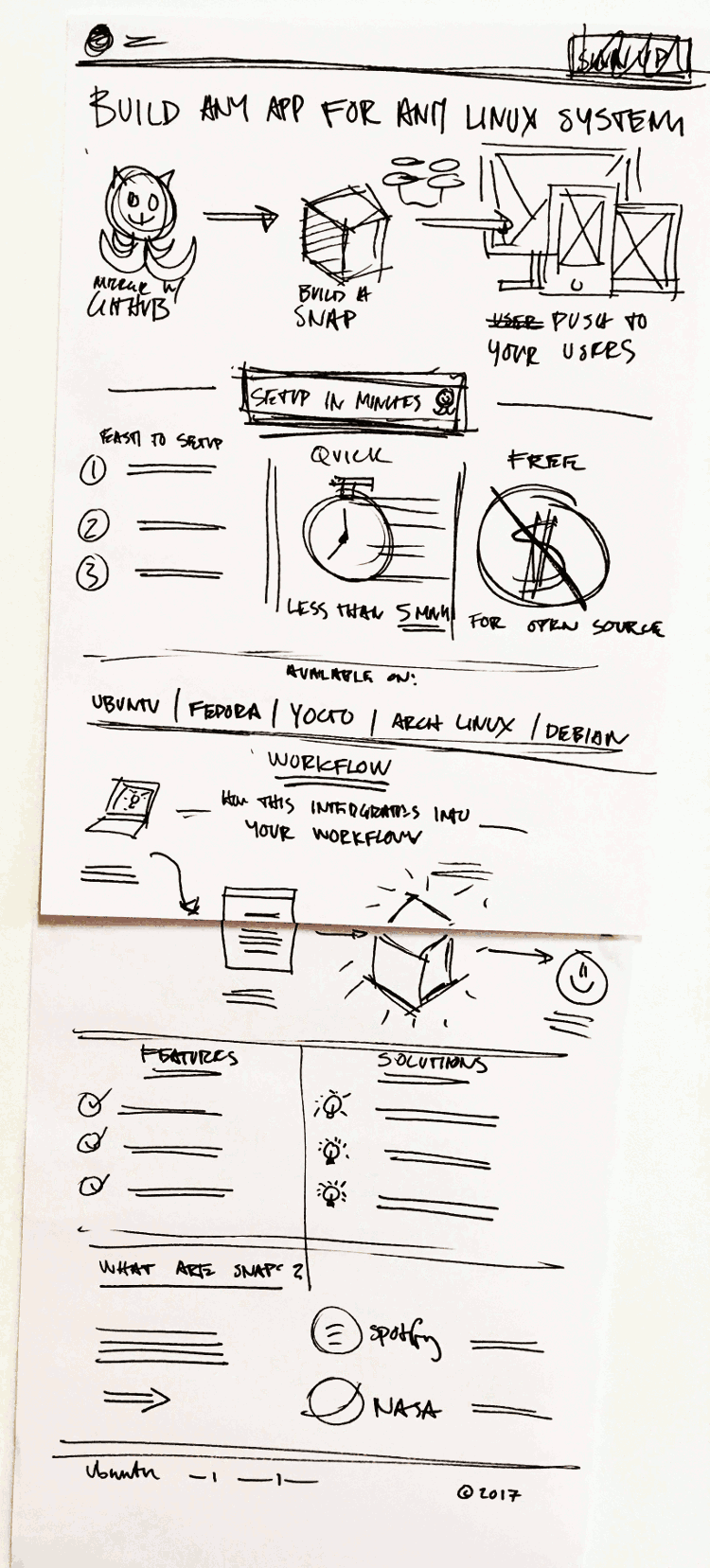 The design patterns in Canonical’s Vanilla CSS framework, for basic components like headings and buttons, made it possible for engineers to lay out pages based directly on the wireframes and functional spec with little need for visual design. But in a few cases, visual designers produced mockups where we had good reason to diverge from existing patterns. And the front page in particular benefited from illustrations by graphics whiz Matthieu James.